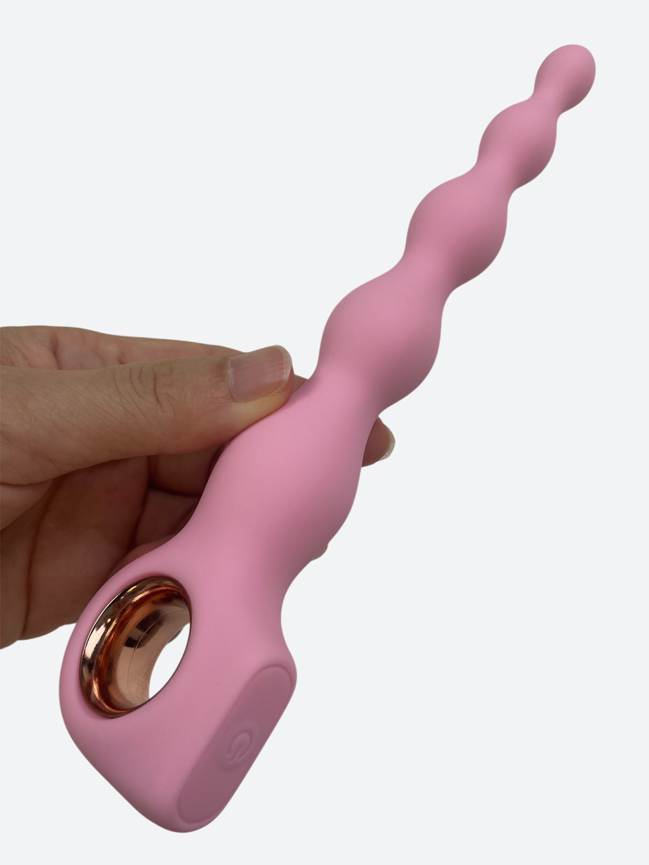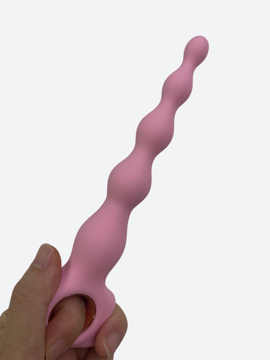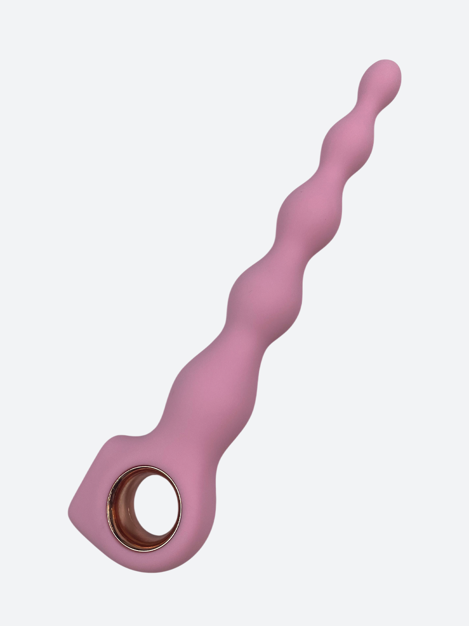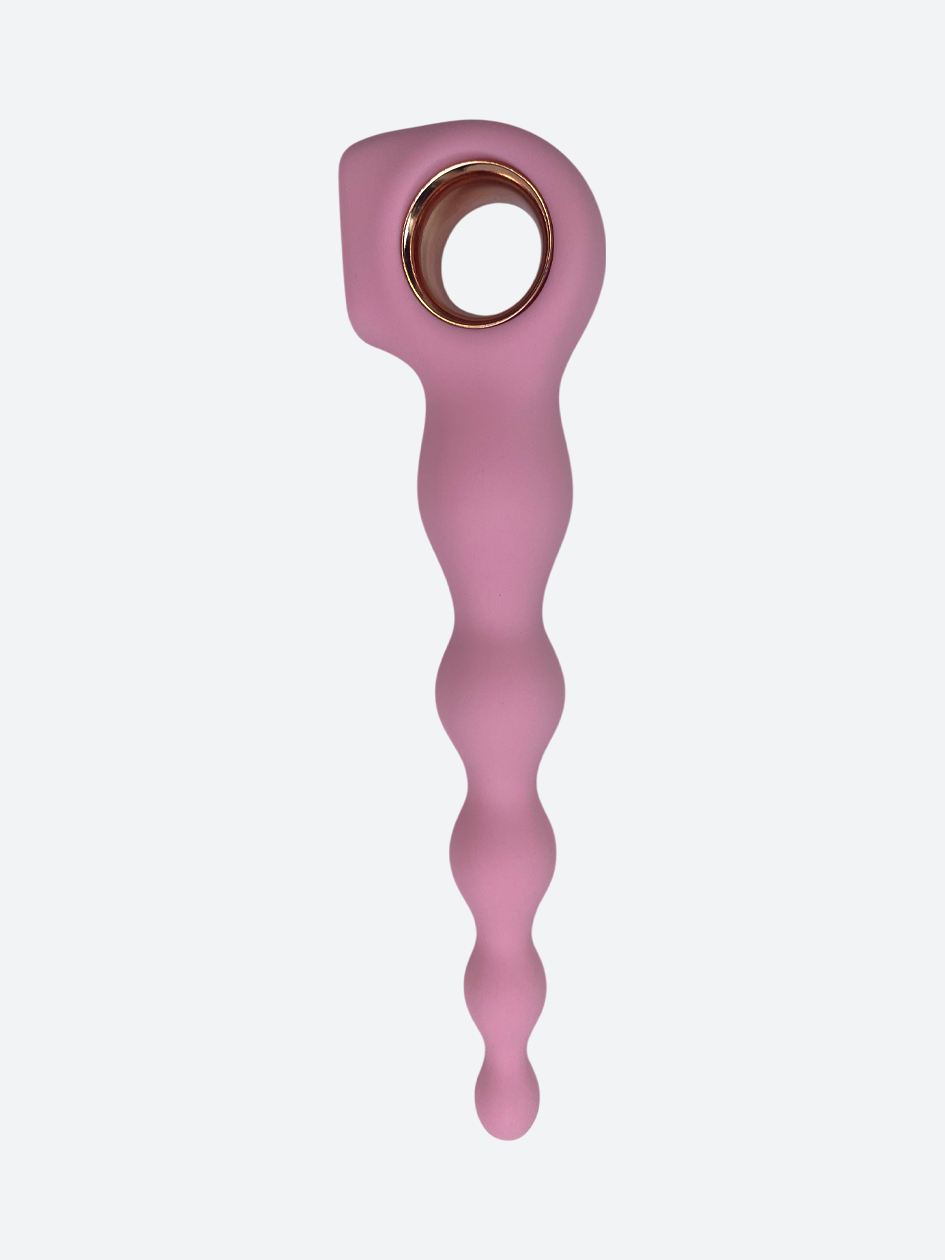 Smooth pink anal vibrator with a beaded shaft, 10 vibration modes, ergonomic finger loop and USB charging. Waterproof and body-safe.