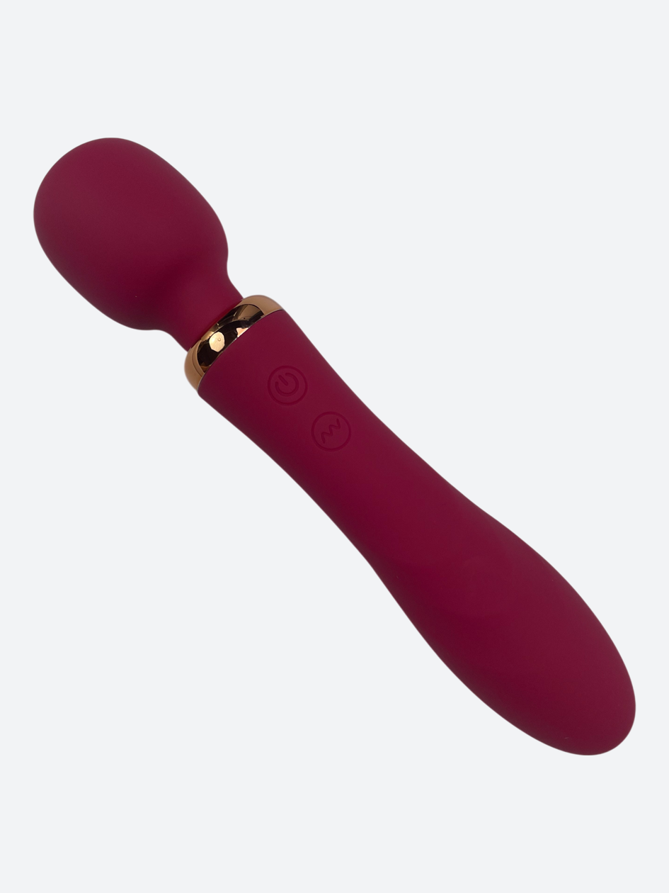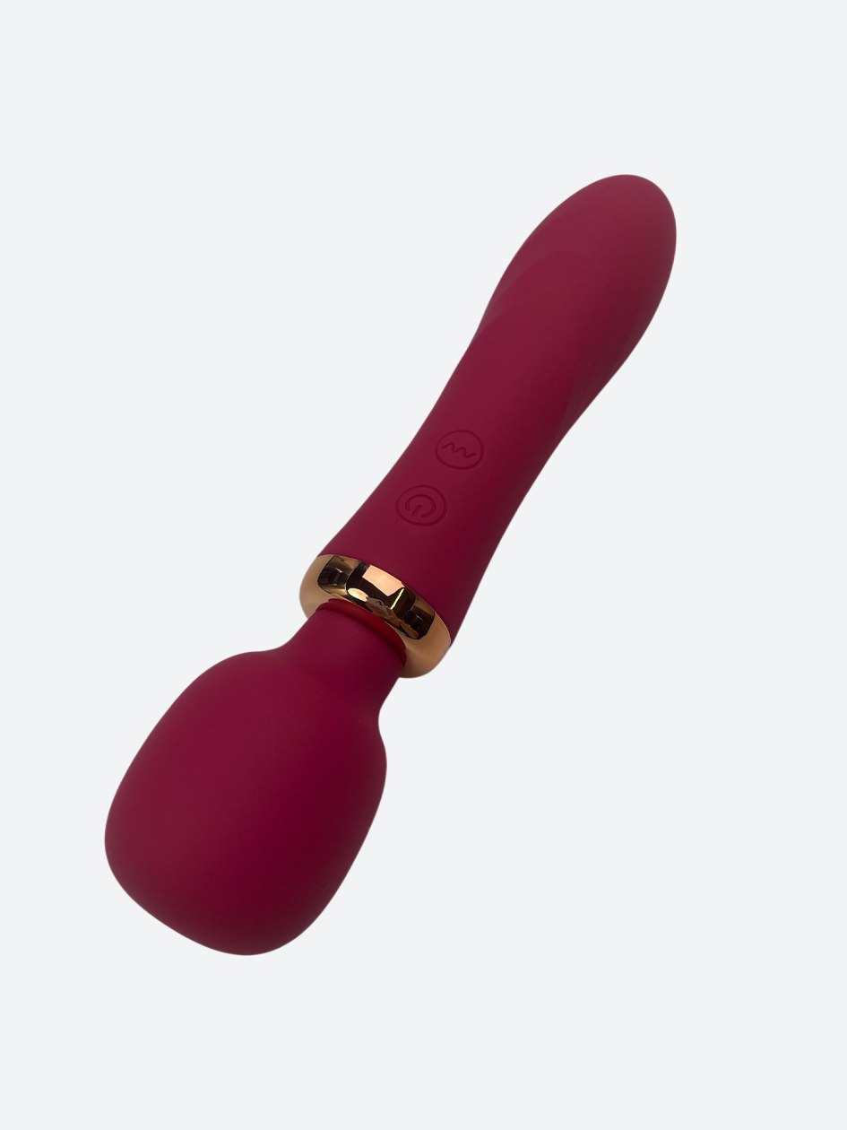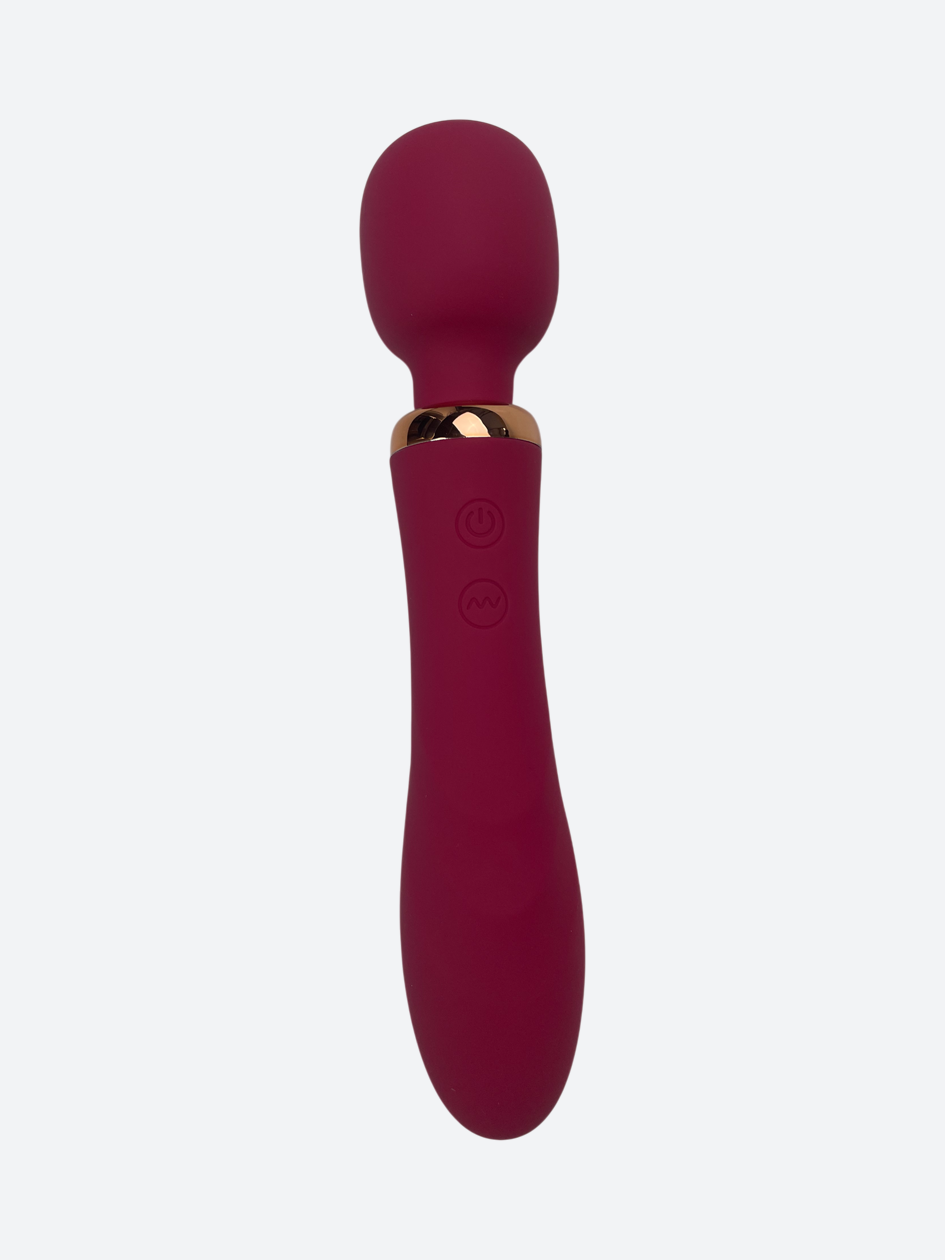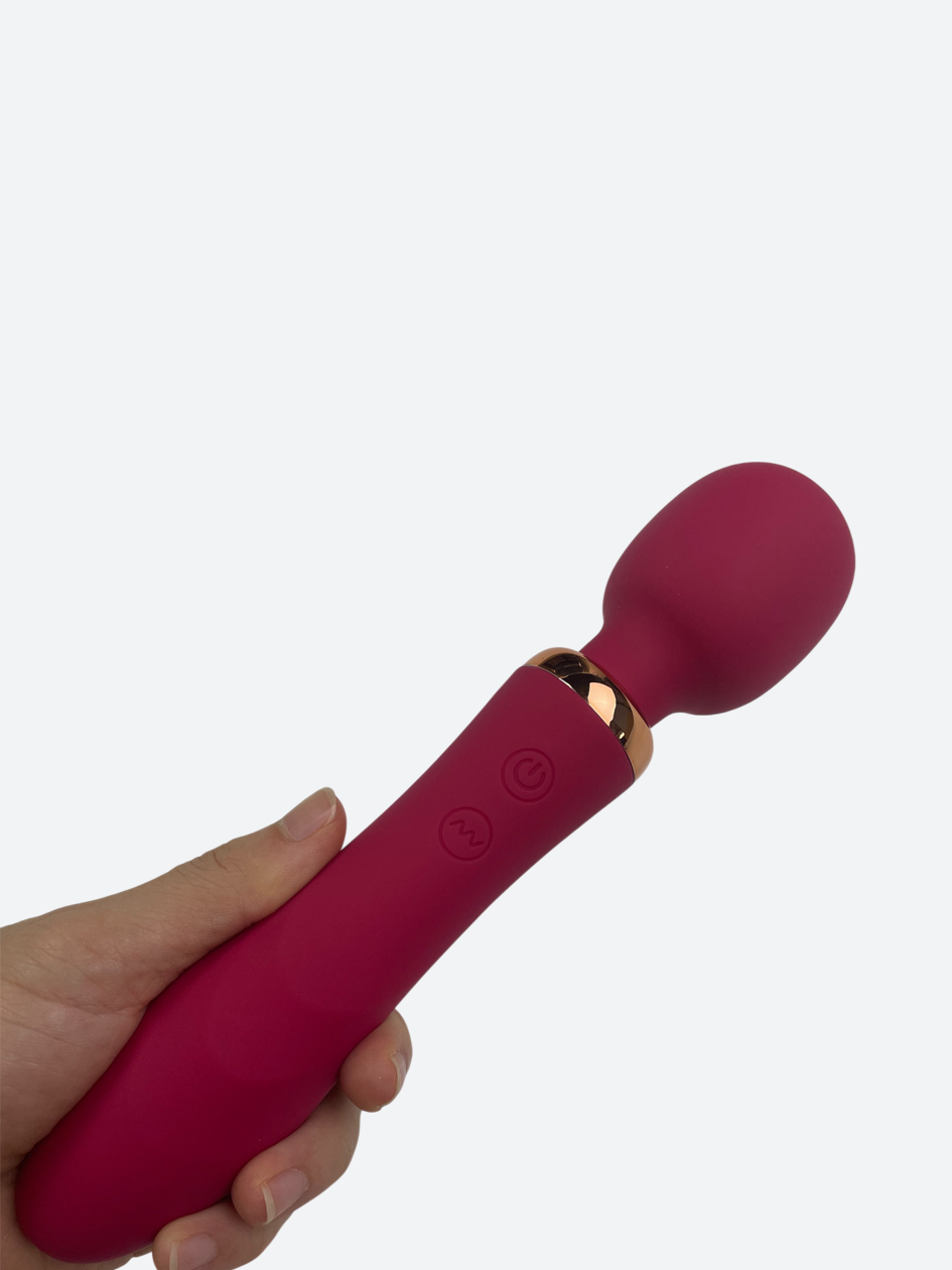 Rechargeable red magic wand with 10 vibrations, body-safe silicone head, USB charging and waterproof design. Perfect for clitoral and body play.